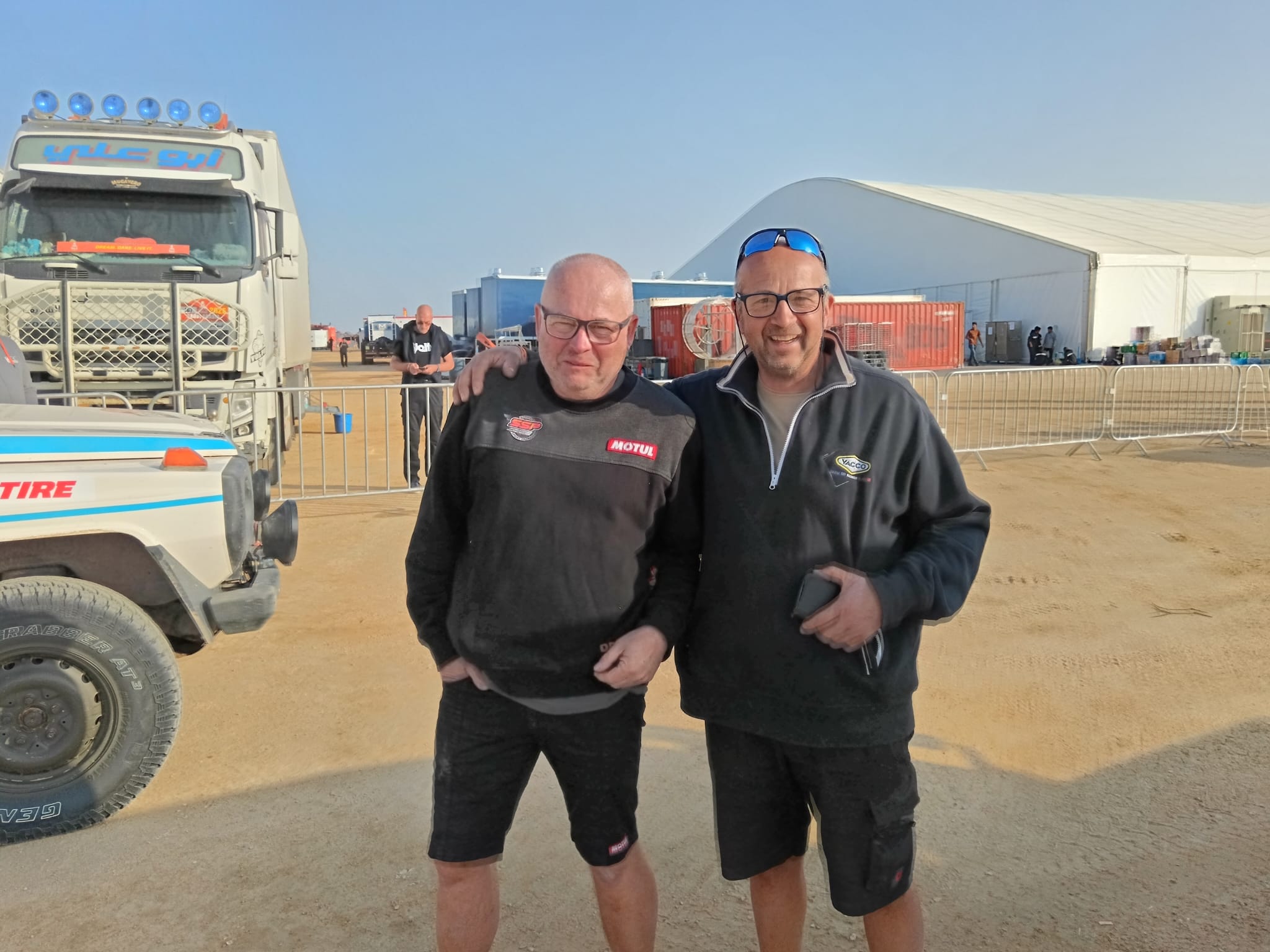 Récupération des véhicules ok, installation au bivouac avec les camions d'assistance, après un long voyage et presque une nuit blanche