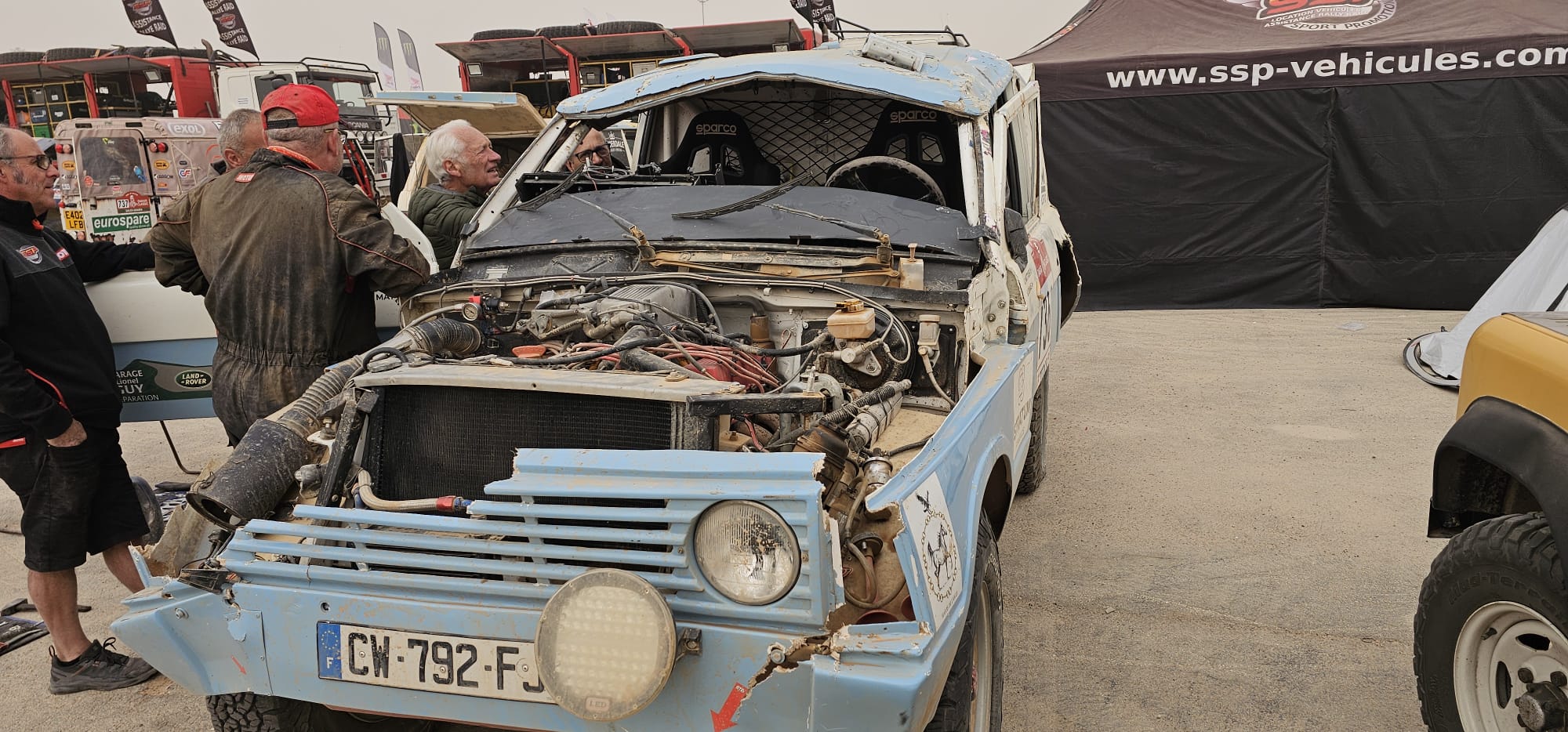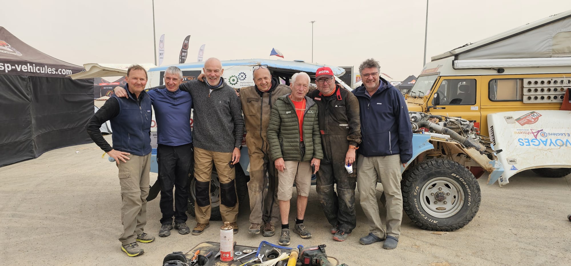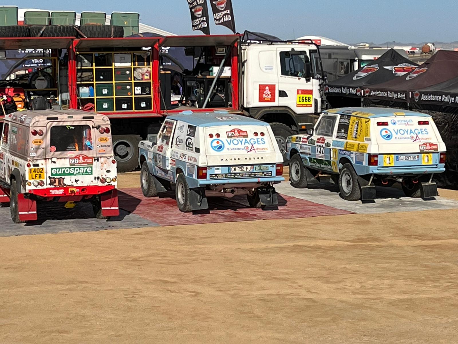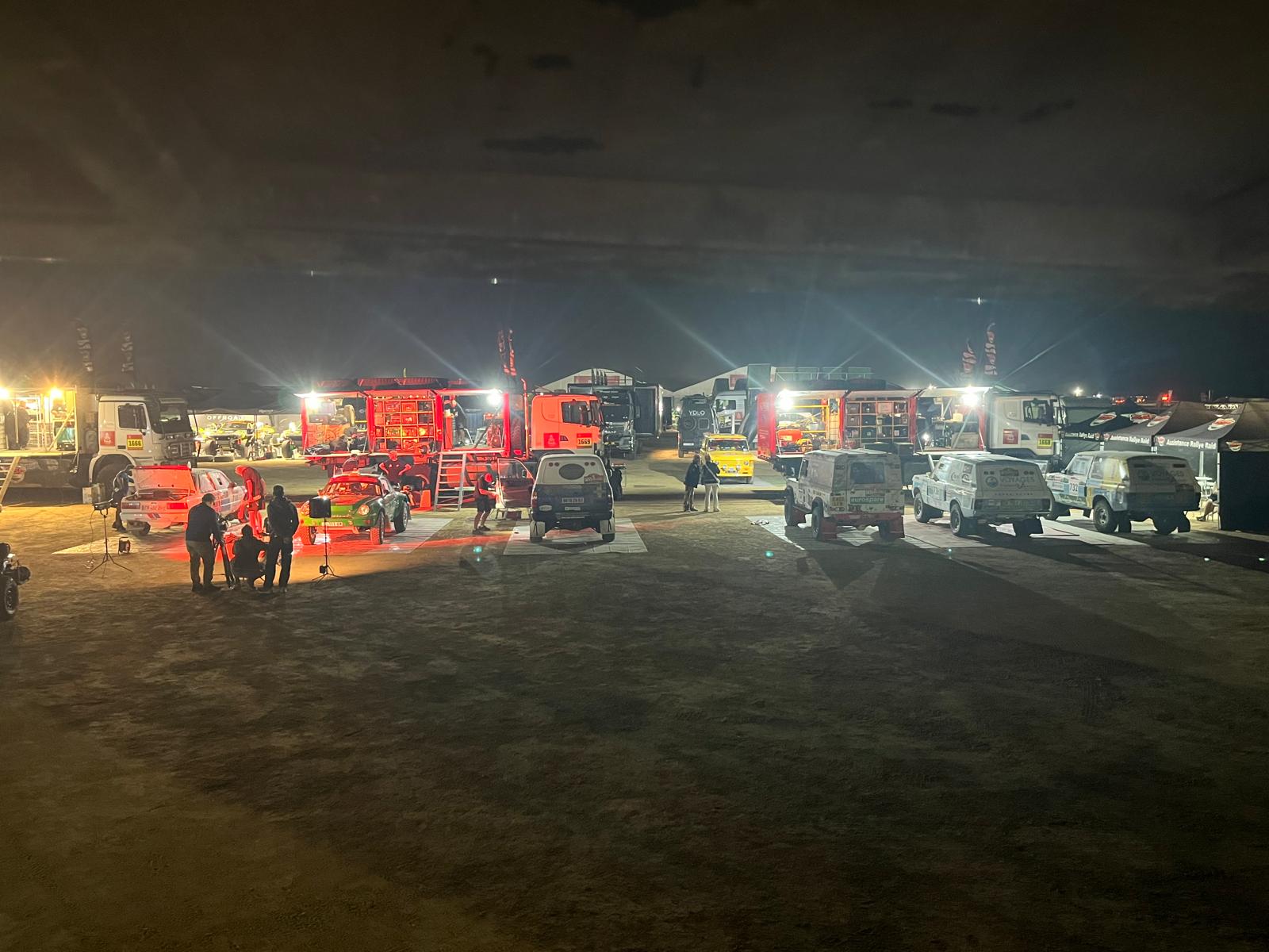 Récupération des véhicules ok, installation au bivouac avec les camions d'assistance, après un long voyage et presque une nuit blanche