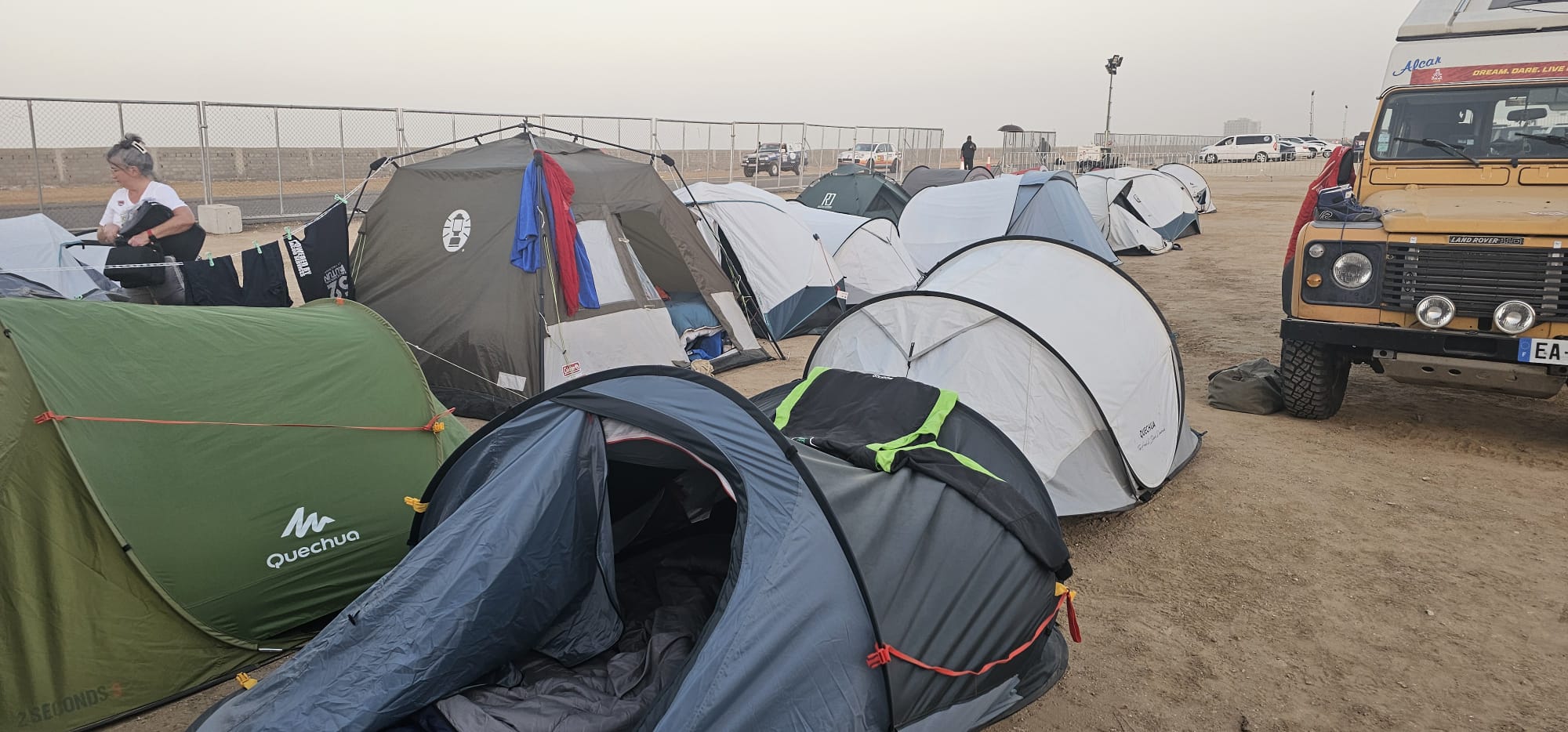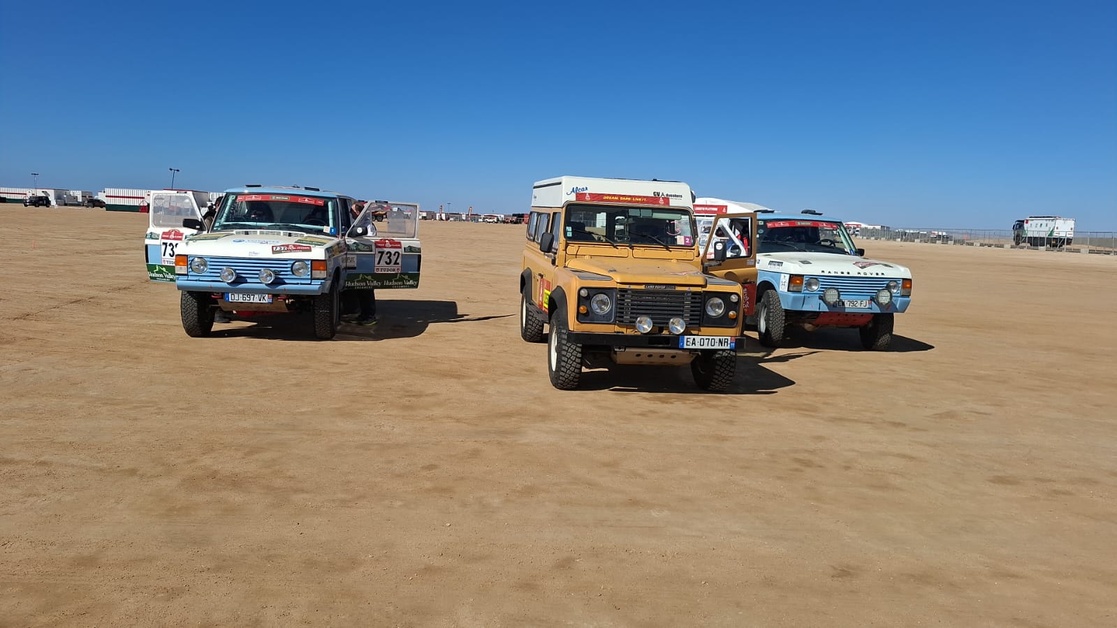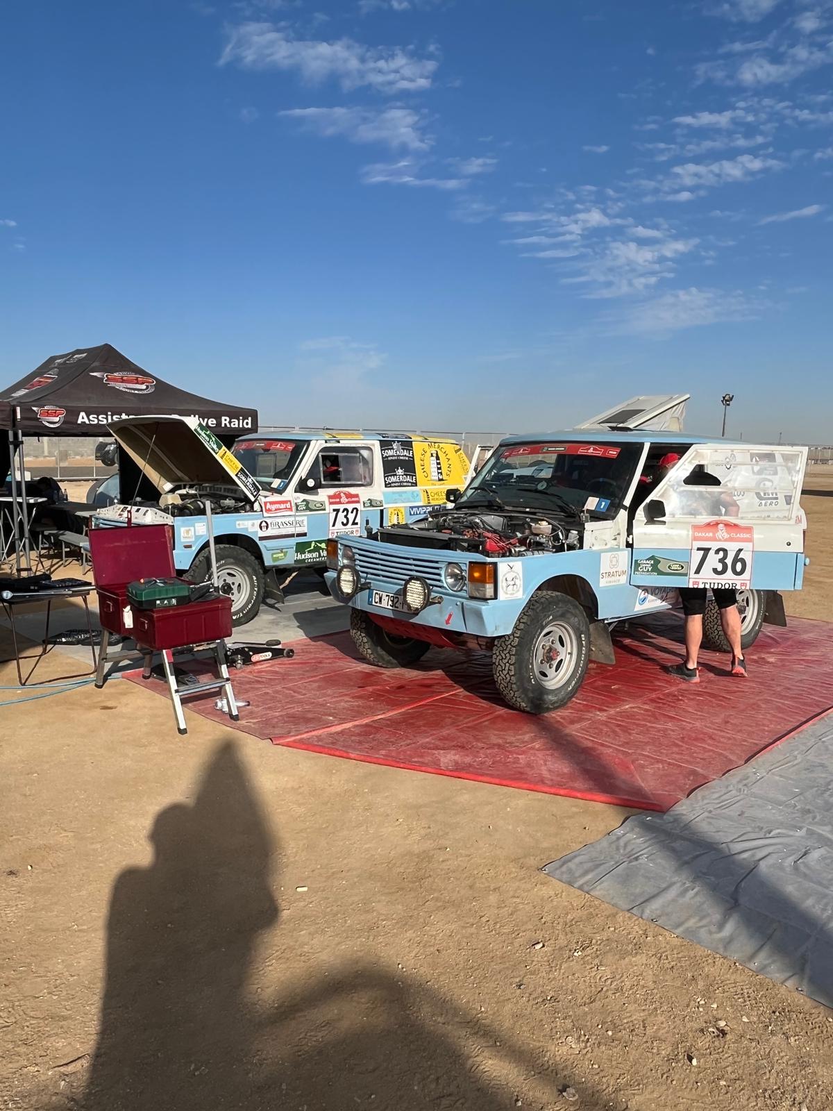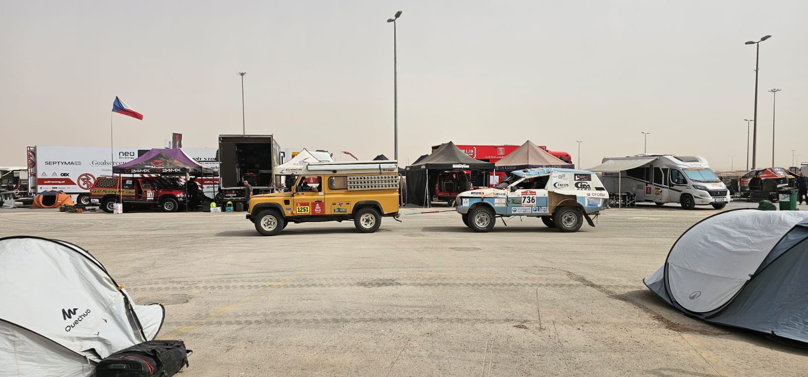 Récupération des véhicules ok, installation au bivouac avec les camions d'assistance, après un long voyage et presque une nuit blanche