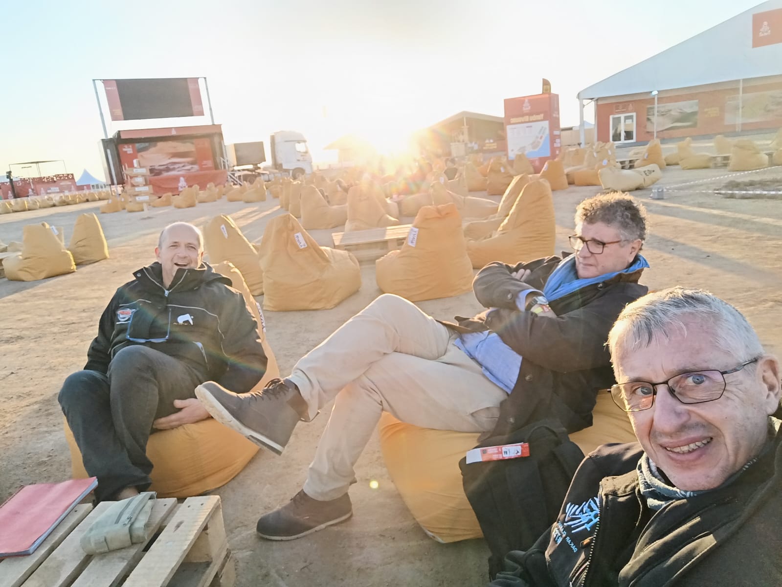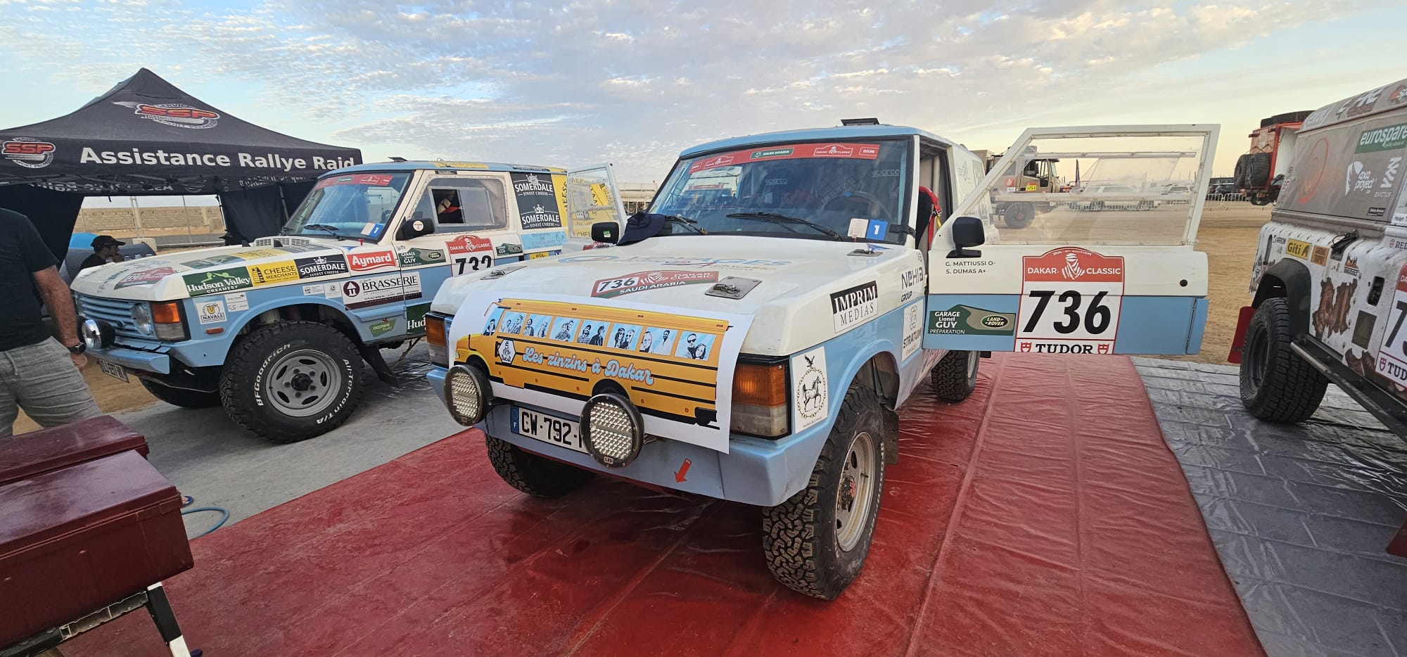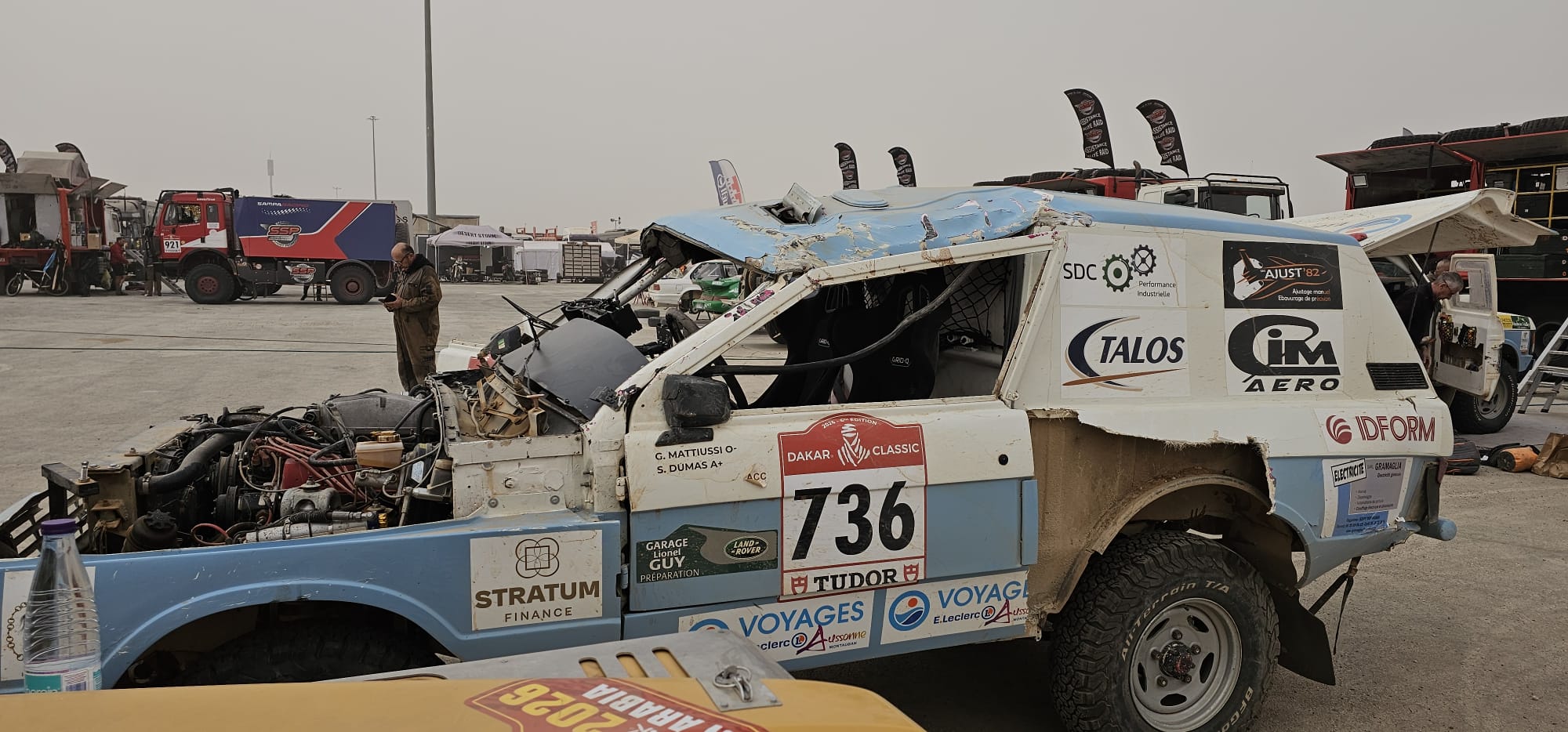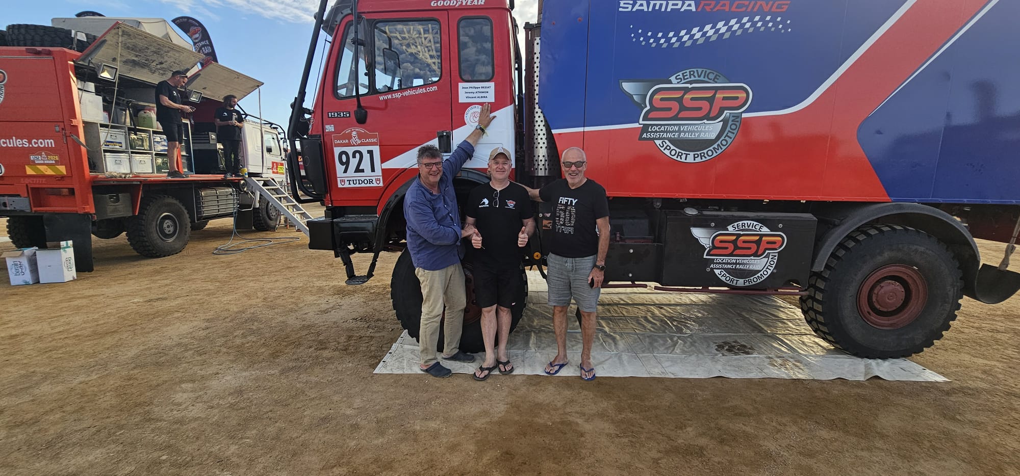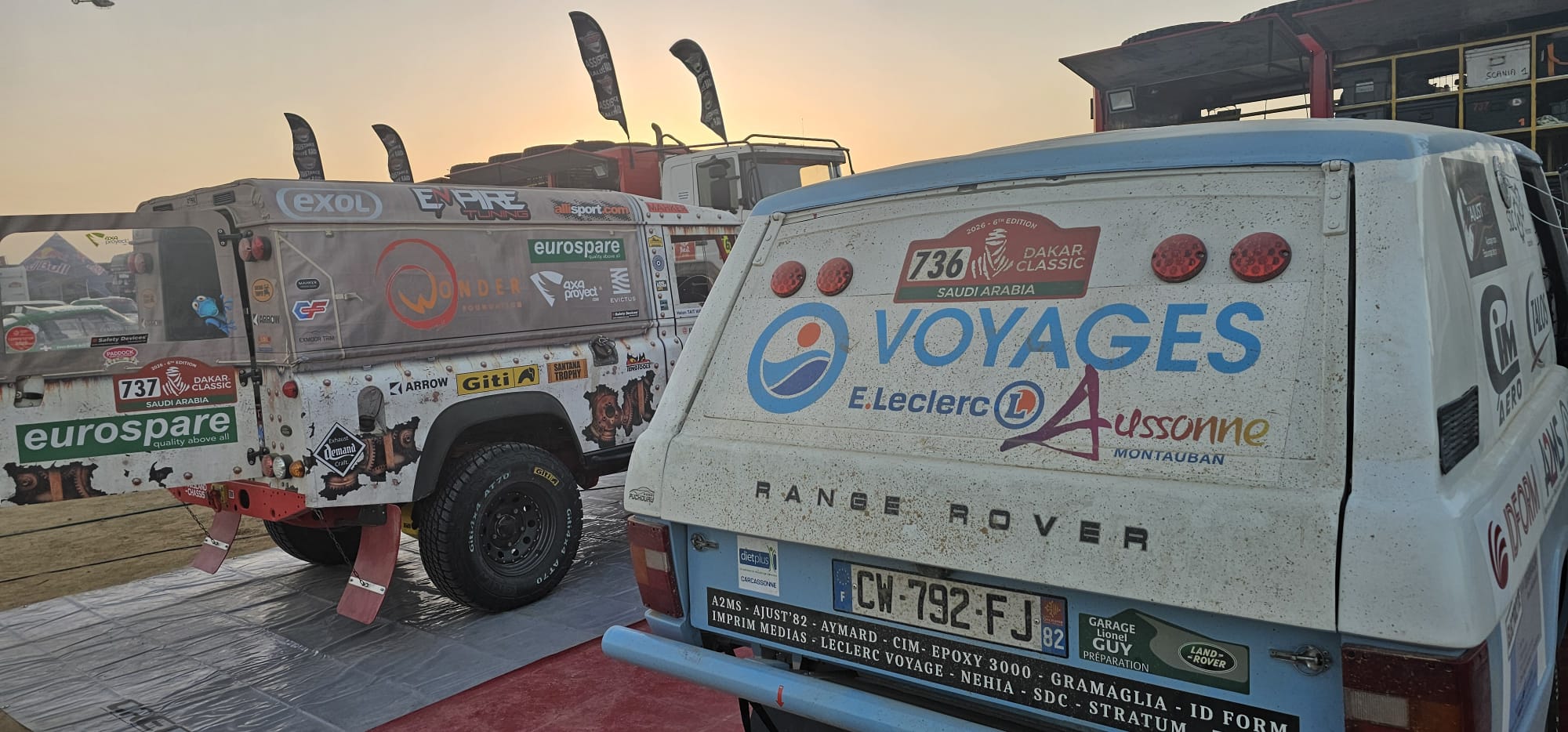 Récupération des véhicules ok, installation au bivouac avec les camions d'assistance, après un long voyage et presque une nuit blanche