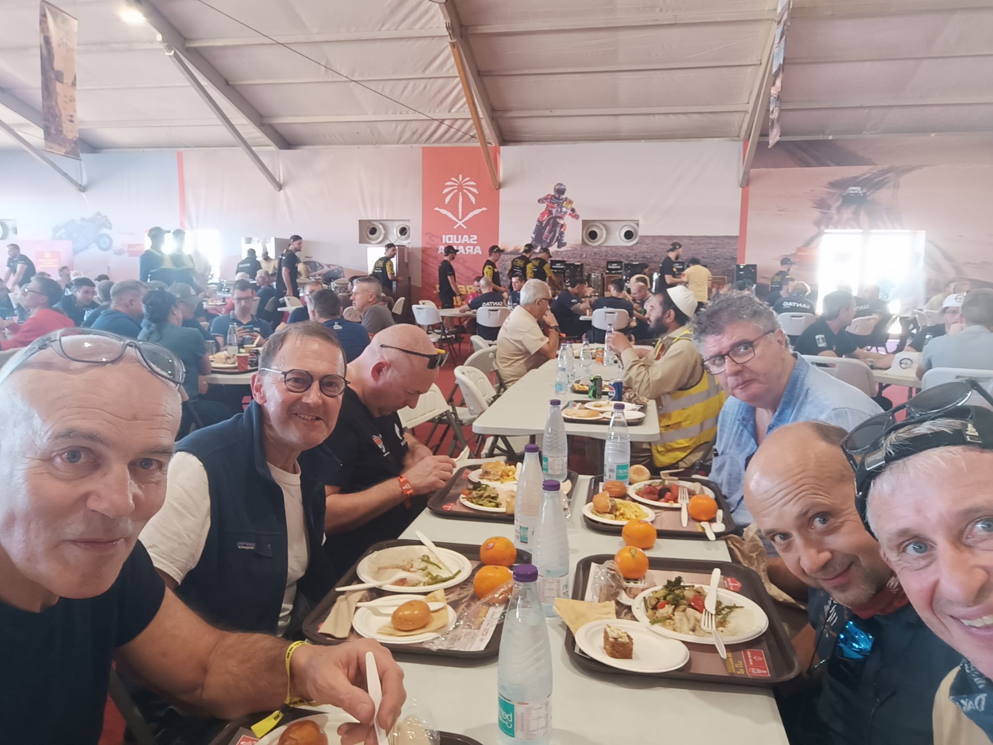 Retour au bivouac ... les amis sont là pour nous remonter le moral. De gauche a droite . Herve Solandt et Laurent Milbergue (la Range 732 toujours en course et bien placée), Sergio, Lionel Guy notre préparateur des Range et le sorcier de la mécanique, ANDRE OLIVIER commissaire technique, le plus chaleureux des membres de l'organisation DAKAR et le plus jeune dans sa tête (le doyen aussi), Philippe BABUT notre autre ange gardien mécanique et Dino votre serviteur.